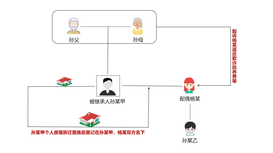 孙某甲的父母向法院起诉,主要诉求为:1.孙某甲、杨某名下房屋归原告所有;2.杨某涉嫌欺诈性抚养,杨某应赔偿抚养孙某乙17年抚养费共计204000元;3.杨某赔偿原告精神损害赔偿金60000元。