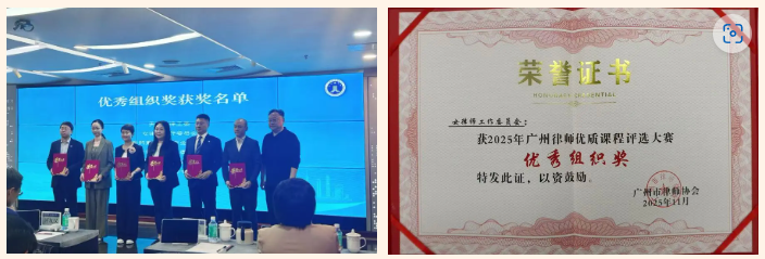 同时,在此次大赛中,广州市律师协会女律师工作委员会的律师们积极响应、踊跃投稿,提交了多项高质量课程作品,凭借出色的组织与广泛的参与度,委员会成功斩获“优秀组织奖”。