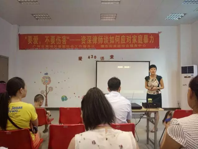 2016年8月21日上午,华南婚姻家事律师团队应邀深入一线,来到黄埔区穗东街家庭服务中心举办反家庭暴力主题的公益讲座。
