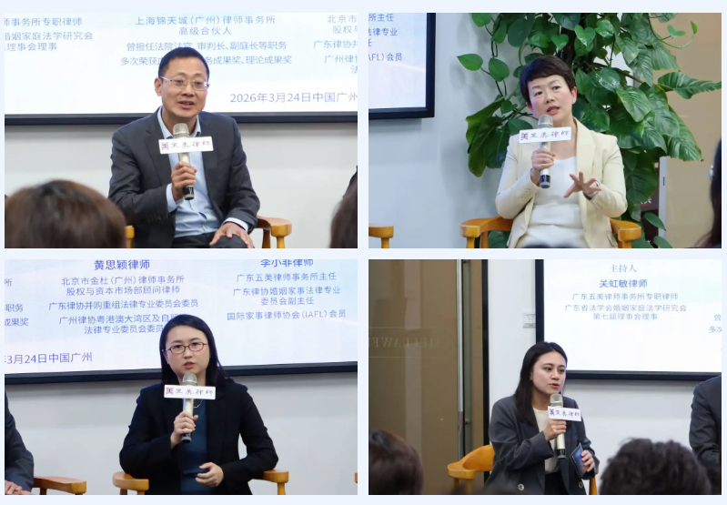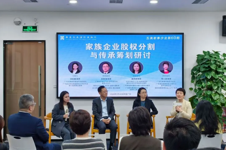 2026年3月24日,广东五美律师事务所第六十期五美家事沙龙顺利举办。本次沙龙以“家族企业股权分割与传承筹划”为核心主题,特邀上海锦天城(广州)律师事务所高级合伙人彭胜锋律师,北京市金杜(广州)律师事务所黄思颖律师,与广东五美律师事务所主任李小非律师共同研讨,精准聚焦民营家族企业股权分割争议、长效传承架构搭建、股权合规筹划等核心行业痛点,深度拆解各类实务疑难问题,全方位分享可落地的专业解决方案与实操经验,吸引众多业内律师到场参与深度交流研讨。